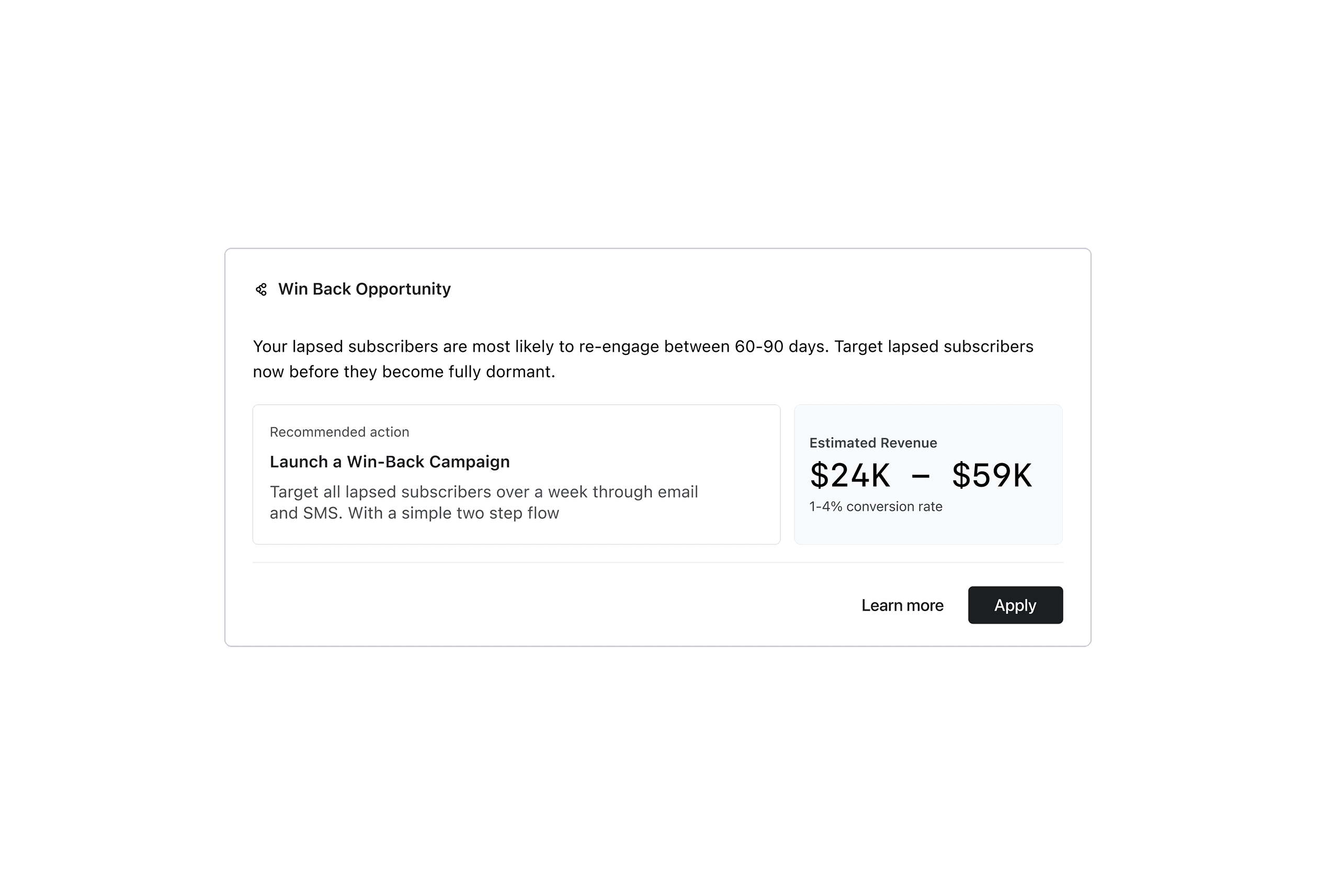 We packaged the analysis into a single atomic unit. This card reveals the specific data pattern (the "why"), quantifies the estimated revenue at stake (the value), and offers a direct CTA to execute the strategy. This removes the friction between identifying an opportunity and capturing it.
