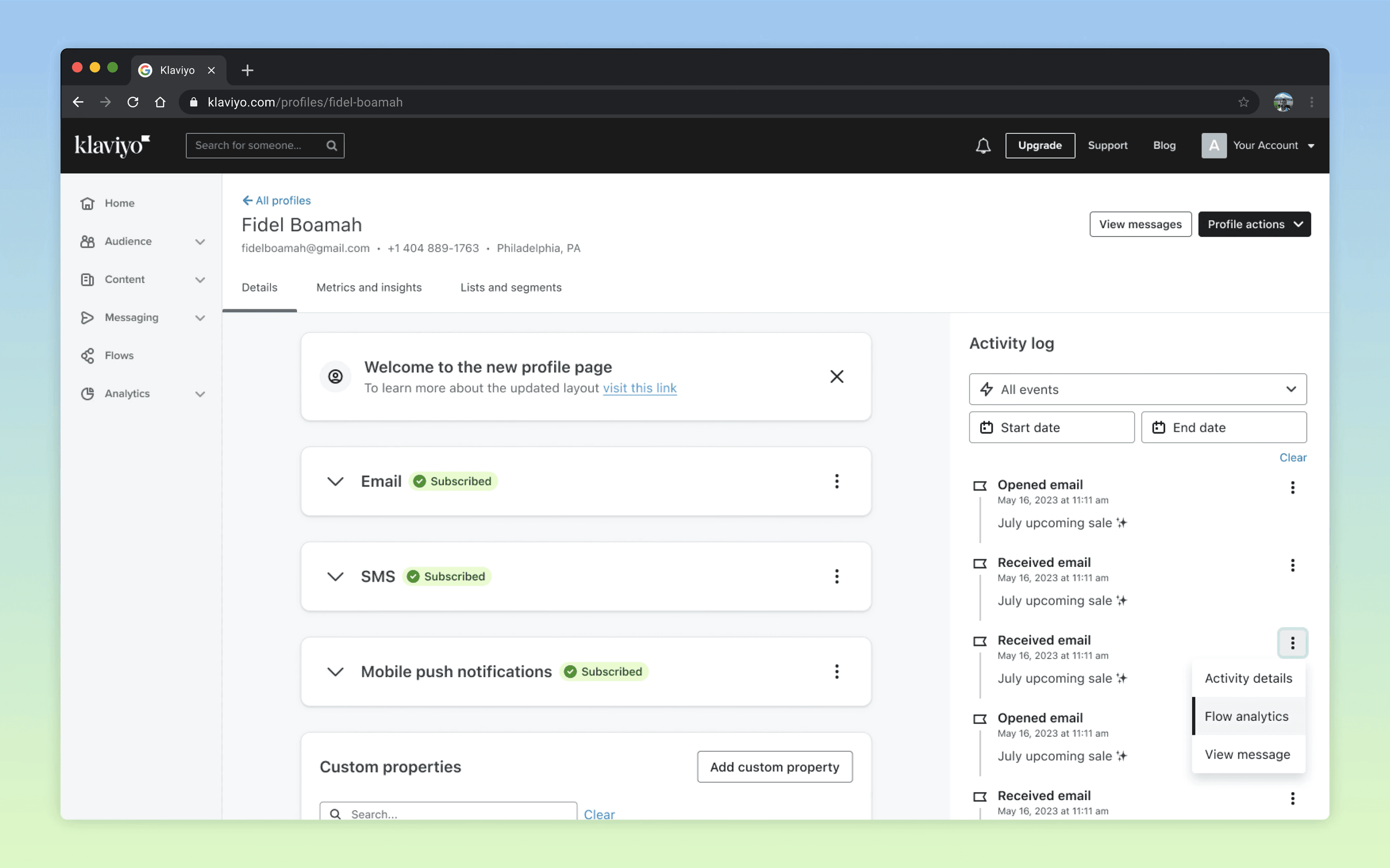 I led the redesign of Klaviyo's most legacy product area, Profiles. Inspired by the opportunity of a technical migration, I influenced a pivot from a mere 1:1 conversion of the profiles experience to a complete redesign, optimizing workflows and tools for troubleshooting. The work I did reduced support related tickets by 20% and introduced new components and patterns to the design system.